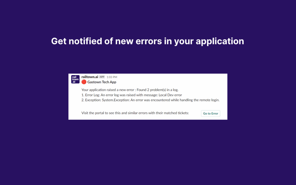 railtown.ai is the easiest way for developers to monitor and resolve errors early. Monitor, diagnose, and prioritize errors from the whole CI/CD environment on a single platform. Our Slack App brings error notifications and weekly reports into the channel of your choice.